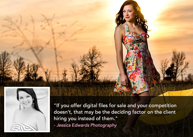 Jessica Edwards is smart when it comes to setting her pricing: she sets the price of her digital files based on what she wants her average sale to be. “Once some clients purchase digital files, they may not buy much else from the photographer,” says Edwards. “For example, I want my average sale to be $2,000+ so I set my smallest digital collection for $2,400.”