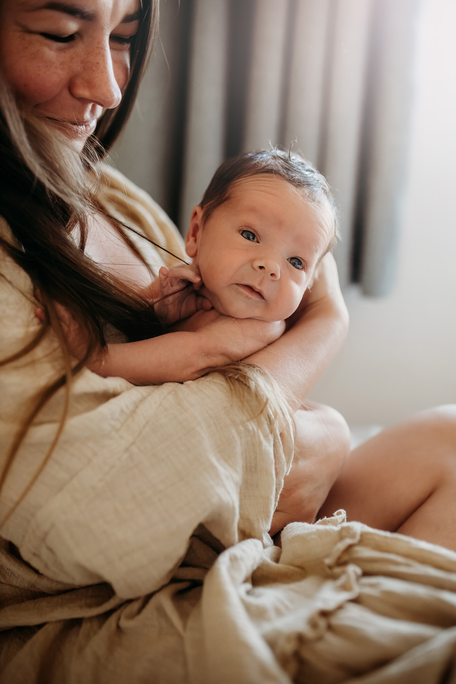 - Soft window light portraits with baby cradled against mom’s chest.